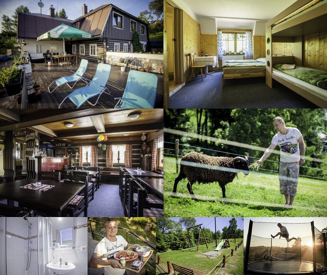 Szállás: Penzion s rodinnou atmosférou, zrekonstruovaný v roce 2015. V penzionu je 36 lůžek ve 2- až 5-lůžkových pokojích. Tři pokoje mají vlastní soc. zařízení, v ostatních případech je vždy pro dva pokoje jedna společná koupelna. Společenská místnost (jídelna) s TV-SAT a videopřehrávačem. Bar s celodenním provozem. Možnost polopenze i plné penze, po vydání večeří i minutkových specialit (dle jídelního lístku). Bezplatné WiFi i parkování před penzionem. Slušní domácí mazlíčci vítáni. Možnost zapůjčení grilu. Nabízíme možnost odvozu k vleku či na nádraží. Penzion je vhodný pro rodiny s dětmi (k dispozici dětské židličky, postýlky, skluzavka, pískoviště apod.) i pro větší skupiny (např. školy v přírodě).