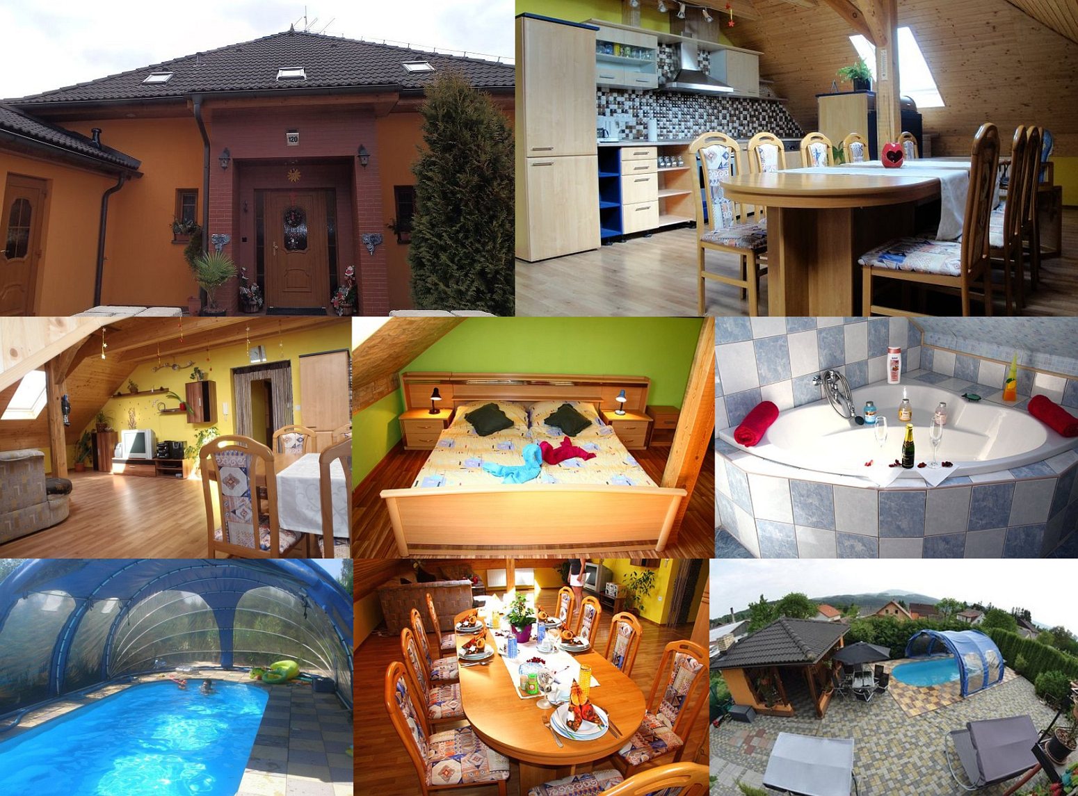 Szállás: Velký podkrovní apartmán v rodinném domu, se třemi ložnicemi celkem pro 10 osob (+ až 2 miminka), s výhledem na Boubín. Možný pronájem jednotlivých pokojů i celého apartmánu. V každé ložnici je manželská postel, TV, velká skříň a možnost přistýlky. Na vyžádaní dětská postýlka a stolička. Pro všechny pokoje je společná koupelna, WC, obývací místnost s rozkládacím gaučem (2 přistýlky), TV, DVD, hifi a plně vybavená kuchyň s jídelnou. Bezplatné WiFi v celém objektu. Před domem je venkovní posezení v altánu s krbem, zastřešený bazén, pro děti houpačky, skluzavka, pískoviště a dětský domeček.