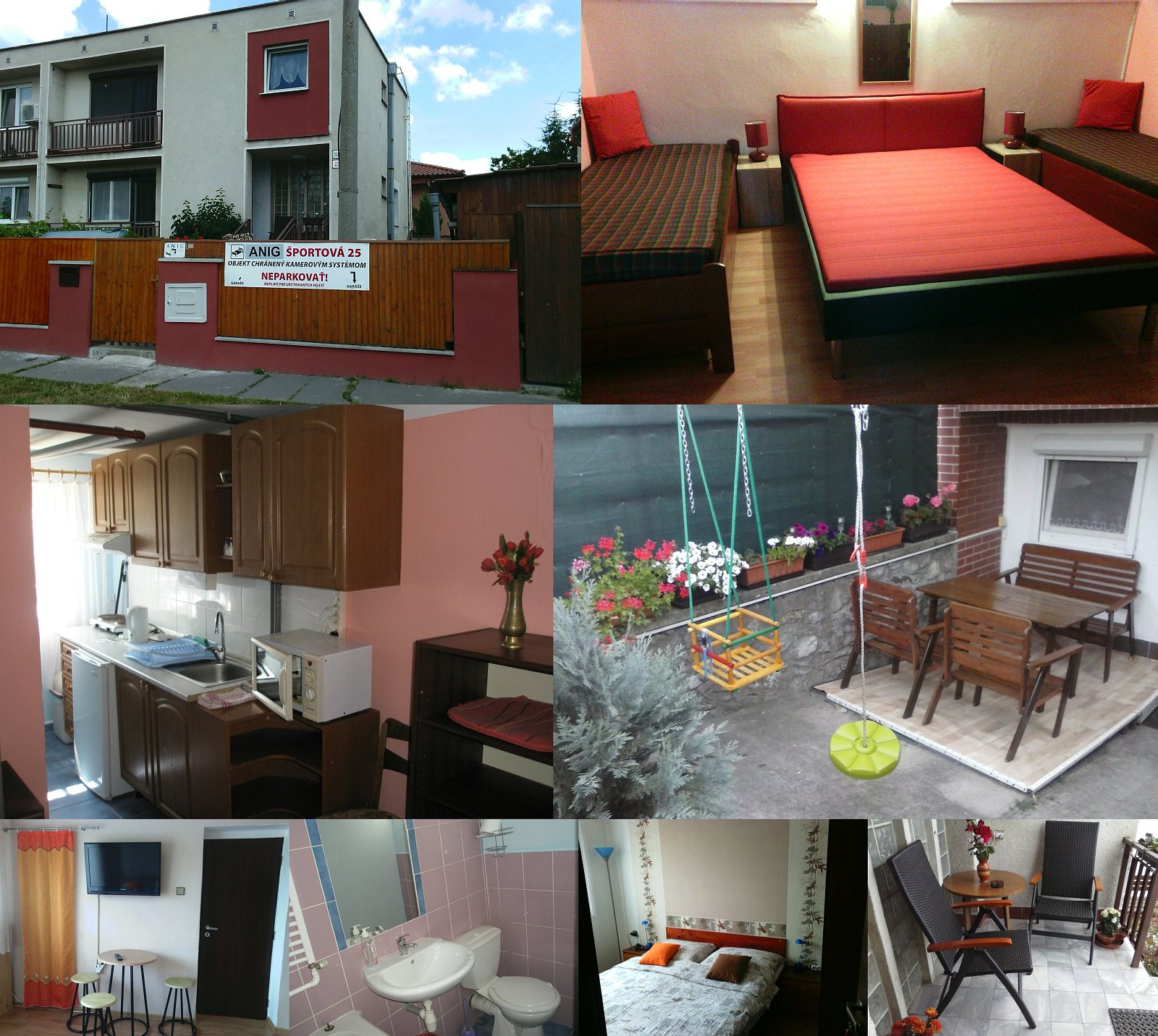 Dobry den rada se pridam k recenzim!Penzio Anig jsme si vybrali z duvodu ze nas zaujali recenze jak na penzion tak i na pani Ruhingovou.Ale vse pro nas bylo zklamanim nemluve hned pri prijezdu v cene jsme meli mit zajistene parkovani hned u penzionu ale smula misto nebylo zajistene museli jsme si najit vlastni parkovani a pri tom nas pani obeznamila s tim ze si mame zavolat odtahovku na auto ktere parkovalo na nasem zaplacenem miste.Toto snad je povinost majitelky uz vuci platicim hostum.Celkem dost nas zarazilo ubytovani v byvale garazi o tom jsme nebyli informovani ale budis neresili jsme.Prekousla jsem i to ze jsme si musela sama uklidit podlahu!!Marne jsme hledala terasu ktera tam mela byt jak nam pani psala.Terasou bylo nazyvano to pidi mistecko pred garazi s dvema spinavyma zidlickama a stoleckem.A muzu pokracavat tim ze kdyz si muj rocni syn hral na zemi a ja si vsimla tech brouku co kolem nem lezli fuj!Stacilo si kleknout a podivat pod linku tam jich bylo taky dost i kdyz uz mrtvy a lednicka ktera hrcela celou noc taky uzasny zazitek takze nazyvat ji novou nehlucnou to bych se hadala.Cele dny jsme travili mimo tzv.apartman jelikoz se ani kafe nedalo pit a to narazim na prispevek kde pani Kokoskova psala ze tam nejsou zvirata a ten vlcak ktery nam kazde rano pelichal pred vchod byl asi neviditelny!!A co se oken tyce tak ty dve malinke s potrhanymi sitkami nad posteli si moc apartman nepomohl a podotykam ze dvere jsme meli otevrene pouze se sitkou ktera mela branit jak jiz bylo uvedeno vstupu tem hnusny broukum!Byla to nase prvni rodina dovolena z ktere jsme si odvezli jedno krasne a to ze Slnecna jezera jsou opravdu krasne ale co se ubytovani tyce urcite uz jen HOTEL!Kde mame jistotu ze se nase dite nebude valet na spine podlaze a do jidla mu nebudou padat psi chlupy.Takze rodinky s detmi at si tam jezdi dale mam pravo vyjadrit svuj nazor a ten je ze konkretne aparman v penzionu Anig nedoporucuji!!Dalsi pokoje nemohu soudit a ani se ktomu nechystame to prozkoumavat.(a jelikoz vim jak funguji internetove stranky verila bych ze si nektere kladne prispevky pise majitelka sama!!je zahadou ze nikdo z ubytovanych zde nenapise jak to opravdu je takze si myslim ze bud jsou cunata nebo si pani pise recenze sama)