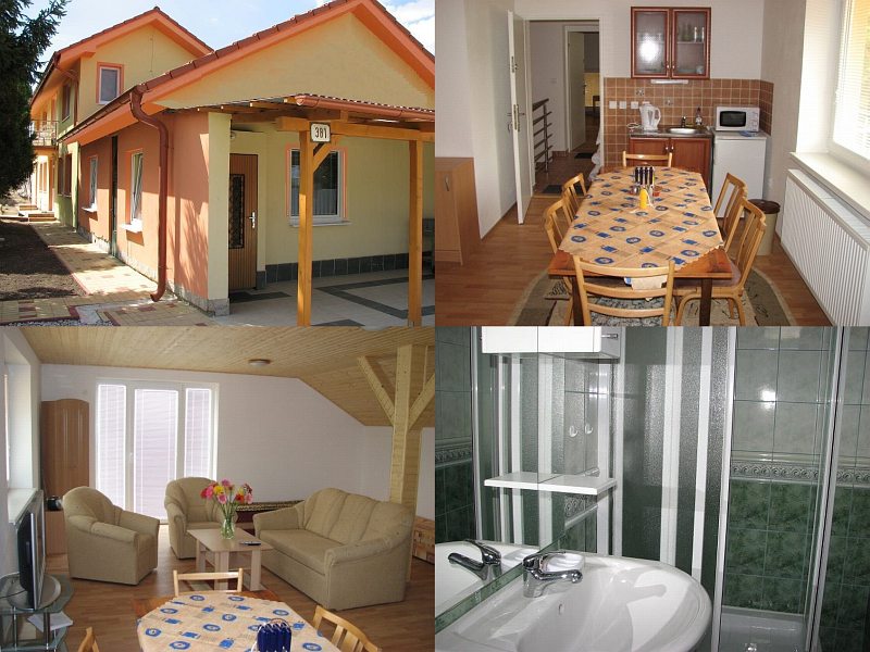 Szállás: Apartmány (5x) s celoročnou prevádzkou, s celkovou kapacitou 17 lôžok + 8 prísteliek (pohovky). Apartmány sú zariadené novým nábytkom v roku 2007, sú s vlastným soc. zariadením, kuchynským kútikom (mikrovlnka, varič, rýchlovarná kanvica, chladnička), farebným TV, DVD, rádiom s CD. Dva balkóny. Spoločenské hry. Vonkajšie posedenie v altánku (grilovanie a opekanie vrátane prípravy gulášu). Areál je oplotený a uzamykateľný (parkovanie vo dvore). Zdarma fitnes miestnosť (stacionárny bycikel, stepper, činky). Húpačky, pieskovisko a trampolína pre deti. Internet zdarma.
