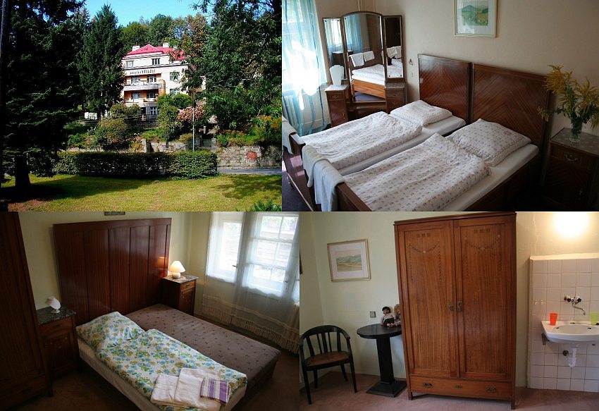 Szállás: Penzion vybavený prvorepublikovým nábytkem. Pronájem dvou samostatných pater. 1. patro: 4x 2-lůžková ložnice (dvě jsou s balkonem), 2x WC, 1 koupelna, kuchyň, infrasauna. 2. patro: 4x 2-lůžková ložnice (dvě jsou s balkonem), 2x WC, 1 koupelna, masérna, ordinace lázeňského lékaře.
