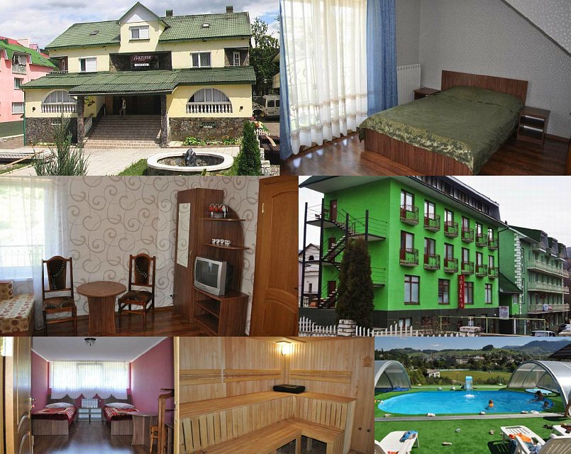 Jazyky: ukrajinština, ruština. Odkaz do mapy je přesný. Fotografie na 1. řádku jsou ze standardních pokojů, na 2. řádku z pololuxusních.